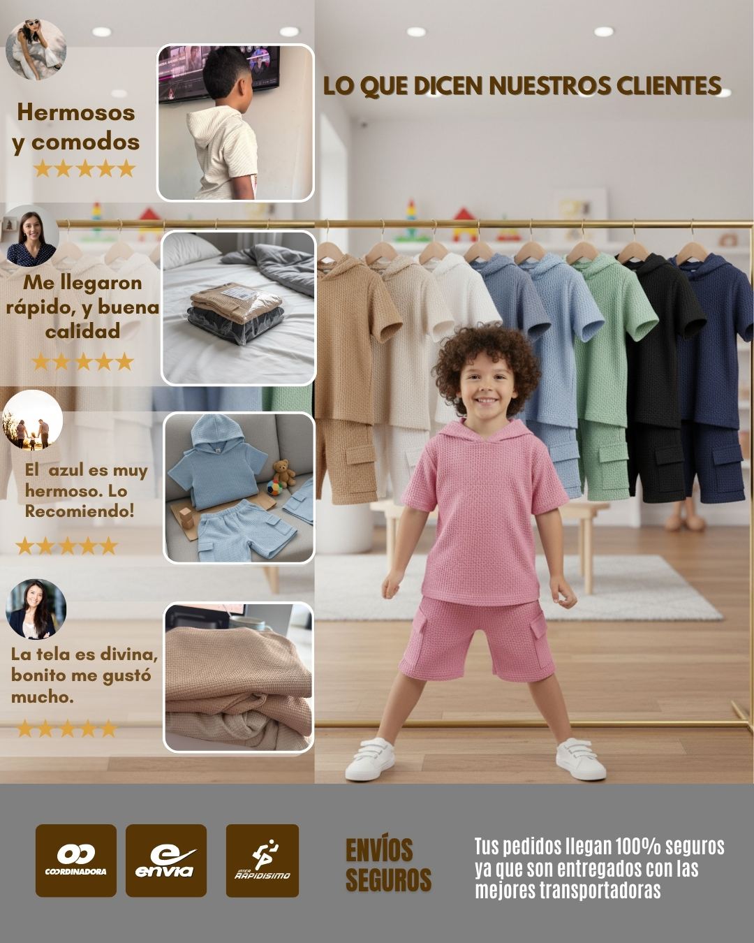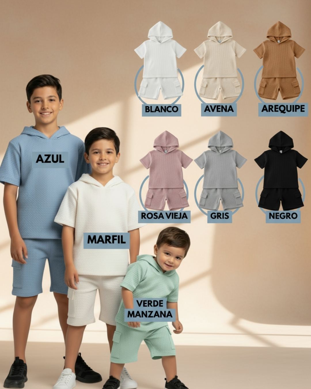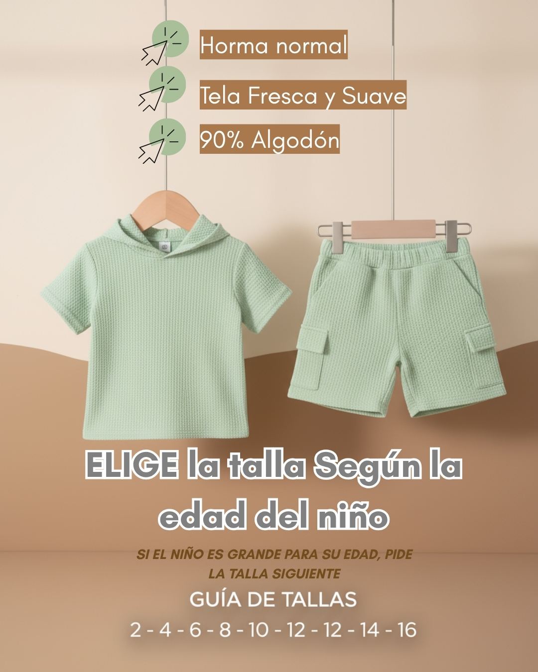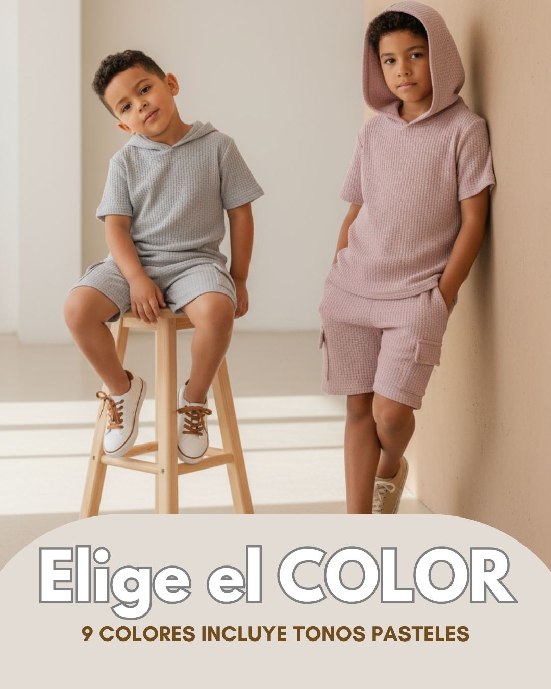 Es de una mezcla de algodón transpirable con textura tipo waffle, muy suave y cómodo para los niños.