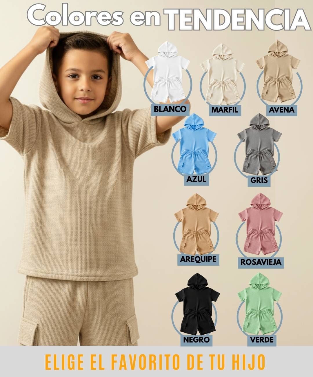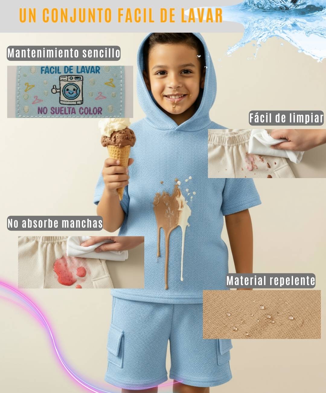Es una tela antifluido es una mezcla de algodón y poliester transpirable con textura tipo waffle, muy suave y cómodo para los niños.